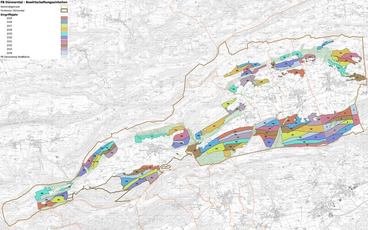 Der Wirtschaftswald von Forst Dünnerntal wird nach den ökologischen Grundsätzen der Dauerwaldbewirtschaftung gepflegt. Dies bedeutet, dass definierte Waldflächen (Bewirtschaftungseinheiten) in einem Turnus von zehn Jahren durchforstet werden. Da hauptsächlich mit der Naturverjüngung gearbeitet wird, werden nur sehr punktuell Bäume gepflanzt. Ziel der Dauerwaldbewirtschaftung ist es, dass auf kleiner Fläche möglichst viele Bäume unterschiedlichen Alters vorkommen. Deshalb werden die Bestände hauptsächlich durchforstet und nicht abgeräumt.